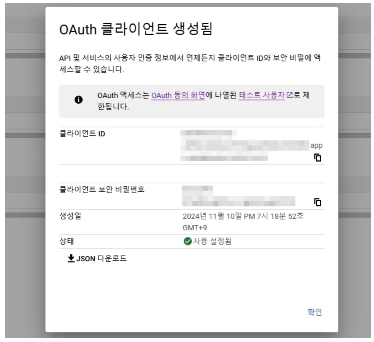 - 생성 완료 후 표시되는 Client ID와 Client Secret을 복사합니다.
