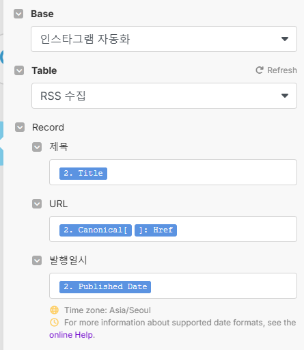이제 Inoreader에서 받은 데이터를 Airtable의 필드에 맞게 매핑합니다.