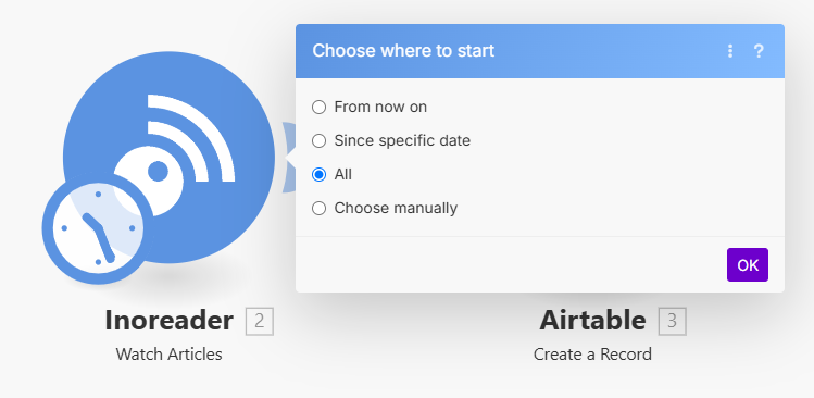 이제 Inoreader와 Airtable을 연결하는 자동화 시나리오를 만들어봅시다.