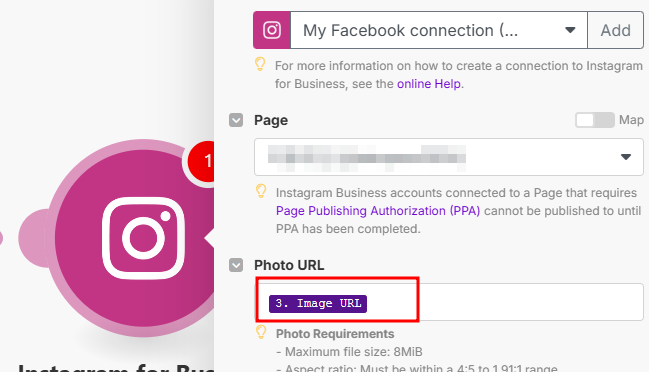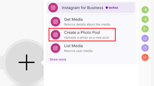 - MAKE.com에서 Instagram for Business → Create Photo Post 모듈을 추가합니다.